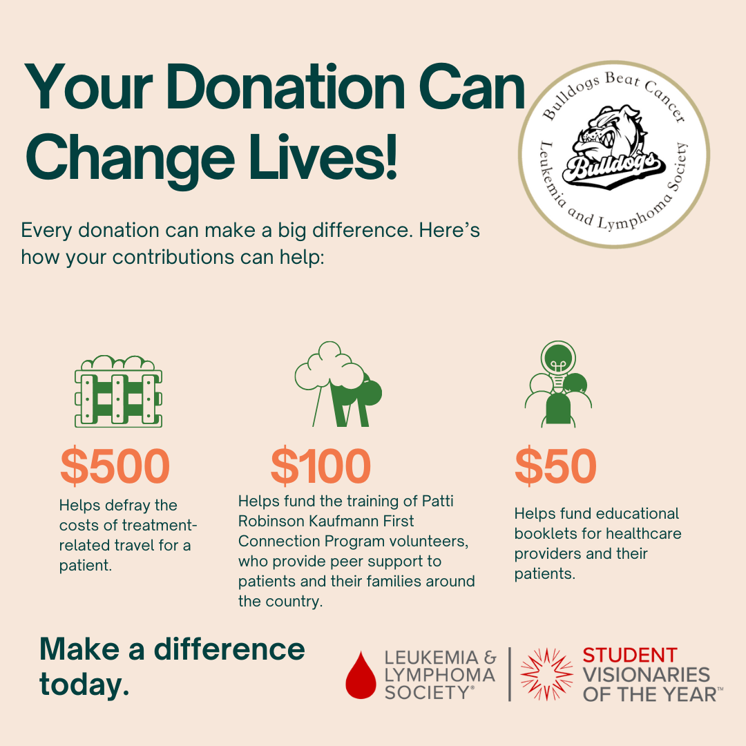 I'm Quinn Theut. I am so excited to announce that I am a candidate for the Leukemia and Lymphoma Society (LLS) Student Visionary of the Year. My friend, Samantha Evans, and I are co-chairing the Bulldogs Beat Cancer Team. Our team goal is to raise $65,000 for blood cancer.